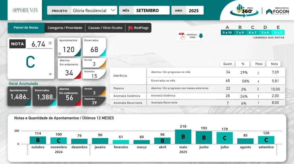 Insights RANKING DA QUALIDADE Top 3 Empreedimentos de Agosto 2025 https://youtu.be/PCJ1OUMa7hA O seu empreendimento poderá ser o próximo a ocupar o Top 3 da Qualidade. Confira os empreendimentos Opportunity que conquistaram o Top 3 da qualidade através da Metodologia V360º da Fócon Engenharia. POSIÇÃO EMPREENDIMENTO CONSTRUTORA NOTA PONTUAÇÃO 4º RESIDENCIAL GLÓRIA SIG CONSTRUTORIA B 7,96 5º RESIDENCIAL VISTA IPANEMA BALASSIANO CONSTRUTORIA B 7,87 6º RESIDENCIAL ZENTURE SCHIPPER CONSTRUTORA B 7,60 7º RESIDENCIAL RARO RASA CONSTRUTORA C 6,94 Ranking Ranking – Agosto de 2025 Ranking – Julho de 2025 Ranking – Junho de 2025 Ranking – Maio de 2025 Ranking – Março de 2025 Painel Comparativo Notas mensais dos últimos 12 meses Dashboard Dashboard – Agosto de 2025 Dashboard – Julho de 2025 Dashboard – Junho de 2025 Dashboard – Maio de 2025 Dashboard – Março de 2025 Resumo das RedFlags Redflags – Agosto de 2025 Redflags – Julho de 2025 Redflags – Junho de 2025 Redflags – Maio de 2025 Redflags – Março de 2025 Pesquisas Construção Civil – Região Sudeste