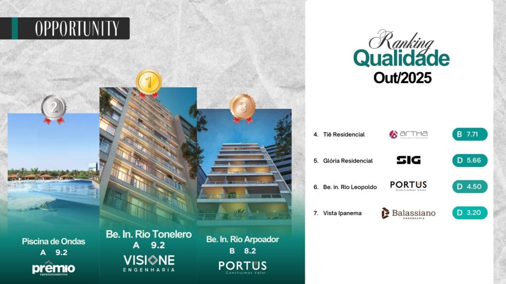 Insights RANKING DA QUALIDADE Top 3 Empreedimentos de Outubro 2025 https://youtu.be/LuMLk2fTj3Y O seu empreendimento poderá ser o próximo a ocupar o Top 3 da Qualidade. Confira os empreendimentos Opportunity que conquistaram o Top 3 da qualidade através da Metodologia V360º da Fócon Engenharia. POSIÇÃO EMPREENDIMENTO CONSTRUTORA NOTA PONTUAÇÃO 1º BE. IN. RIO TONELERO VISIONE CONSTRUTORA A 9,20 2º PISCINA DE ONDAS PRÊMIO CONSTRUTORA A 9,20 3º BE. IN. RIO ARPOADOR PORTUS CONSTRUTORA B 8,20 4º TIÊ RESIDENCIAL ARTHA CONSTRUTORA B 7,71 5º GLÓRIA RESIDENCIAL SIG CONSTRUTORA D 5,66 6º BE. IN. RIO LEOPOLDO MIGUEZ PORTUS CONSTRUTORA D 4,50 7º VISTA IPANEMA RESIDENCIAL BALASSIANO CONSTRUTORA D 3,20 Ranking Ranking – Outubro de 2025 Ranking – Setembro de 2025 Ranking – Agosto de 2025 Ranking – Julho de 2025 Ranking – Junho de 2025 Painel Comparativo Notas Mensais Dashboard Dashboard – Outubro de 2025 Dashboard – Setembro de 2025 Dashboard – Agosto de 2025 Dashboard – Julho de 2025 Dashboard – Junho de 2025 Resumo das RedFlags Redflags – Setembro de 2025 Redflags – Agosto de 2025 Redflags – Julho de 2025 Redflags – Junho de 2025 Redflags – Maio de 2025 Pesquisas Construção Civil – Região Sudeste