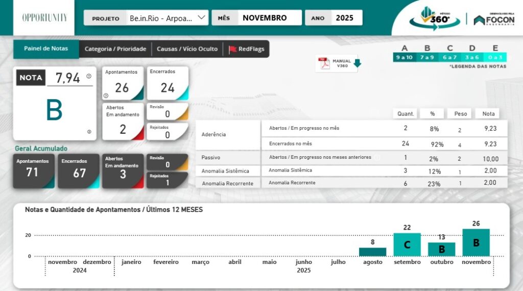 Insights RANKING DA QUALIDADE Top 3 Empreedimentos de Novembro 2025 https://youtu.be/3D3WYcb70Iw O seu empreendimento poderá ser o próximo a ocupar o Top 3 da Qualidade. Confira os empreendimentos Opportunity que conquistaram o Top 3 da qualidade através da Metodologia V360º da Fócon Engenharia. POSIÇÃO EMPREENDIMENTO CONSTRUTORA NOTA PONTUAÇÃO 1º PISCINA DE ONDAS PRÊMIO CONSTRUTORA A 9,20 2º BE. IN. RIO TONELERO VISIONE CONSTRUTORA B 8,40 3º BE. IN. RIO ARPOADOR PORTUS CONSTRUTORA B 7,94 4º TIÊ RESIDENCIAL ARTHA CONSTRUTORA B 7,43 5º BE. IN. RIO LEOPOLDO MIGUEZ PORTUS CONSTRUTORA D 5,92 6º VISTA IPANEMA RESIDENCIAL BALASSIANO CONSTRUTORA D 5,69 7º GLÓRIA RESIDENCIAL SIG CONSTRUTORA D 4,45 Ranking Ranking – Novembro de 2025 Ranking – Outubro de 2025 Ranking – Setembro de 2025 Ranking – Agosto de 2025 Ranking – Julho de 2025 Painel Comparativo Notas Mensais Dashboard Dashboard – Novembro de 2025 Dashboard – Outubro de 2025 Dashboard – Setembro de 2025 Dashboard – Agosto de 2025 Dashboard – Julho de 2025 Resumo das RedFlags Redflags – Setembro de 2025 Redflags – Agosto de 2025 Redflags – Julho de 2025 Redflags – Junho de 2025 Redflags – Maio de 2025 Pesquisas Construção Civil – Região Sudeste