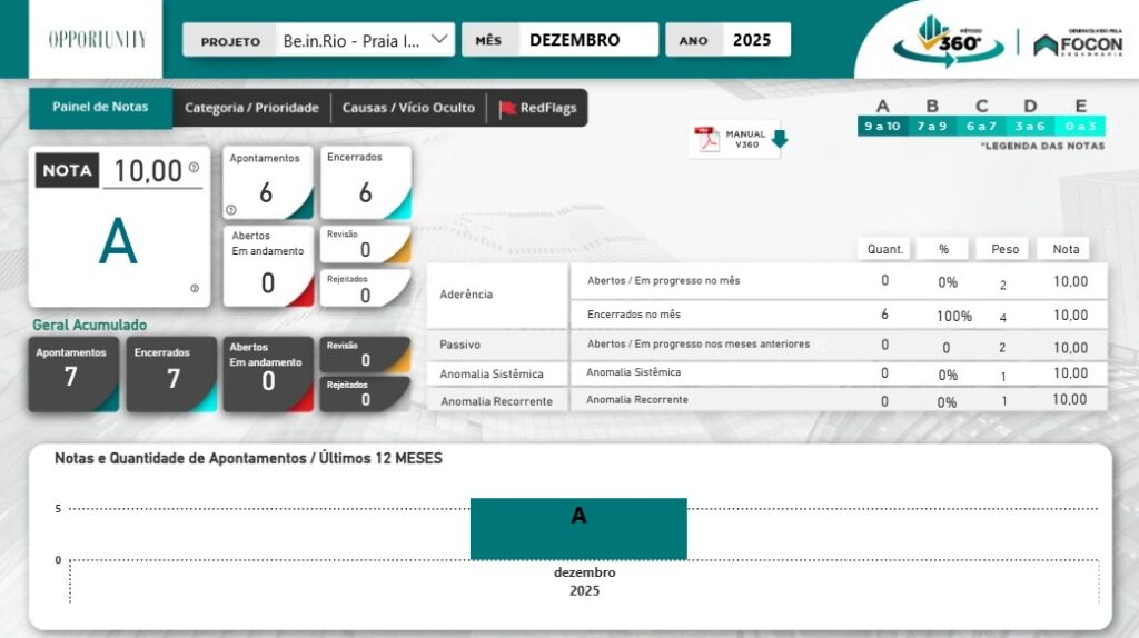 Insights RANKING DA QUALIDADE Top 3 Empreedimentos de Março 2025 https://youtu.be/IG1cM4F0E0U O seu empreendimento poderá ser o próximo a ocupar o Top 3 da Qualidade. Confira os empreendimentos Opportunity que conquistaram o Top 3 da qualidade através da Metodologia V360º da Fócon Engenharia. POSIÇÃO EMPREENDIMENTO CONSTRUTORA NOTA PONTUAÇÃO 4º RESIDENCIAL RARO RASA CONSTRUTORIA B 7,63 5º RESIDENCIAL GLÓRIA SIG CONSTRUTORIA B 7,60 6º RESIDENCIAL NURBAN PRÊMIO CONSTRUTORA D 5,80 Ranking Maio de 2025 Março de 2025 Abril de 2025 Painel Comparativo Notas mensais dos últimos 12 meses Dashboard Maio de 2025 Março de 2025 Abril de 2025 Resumo das RedFlags Maio de 2025 Março de 2025 Abril de 2025 Pesquisas Construção Civil – Região Sudeste